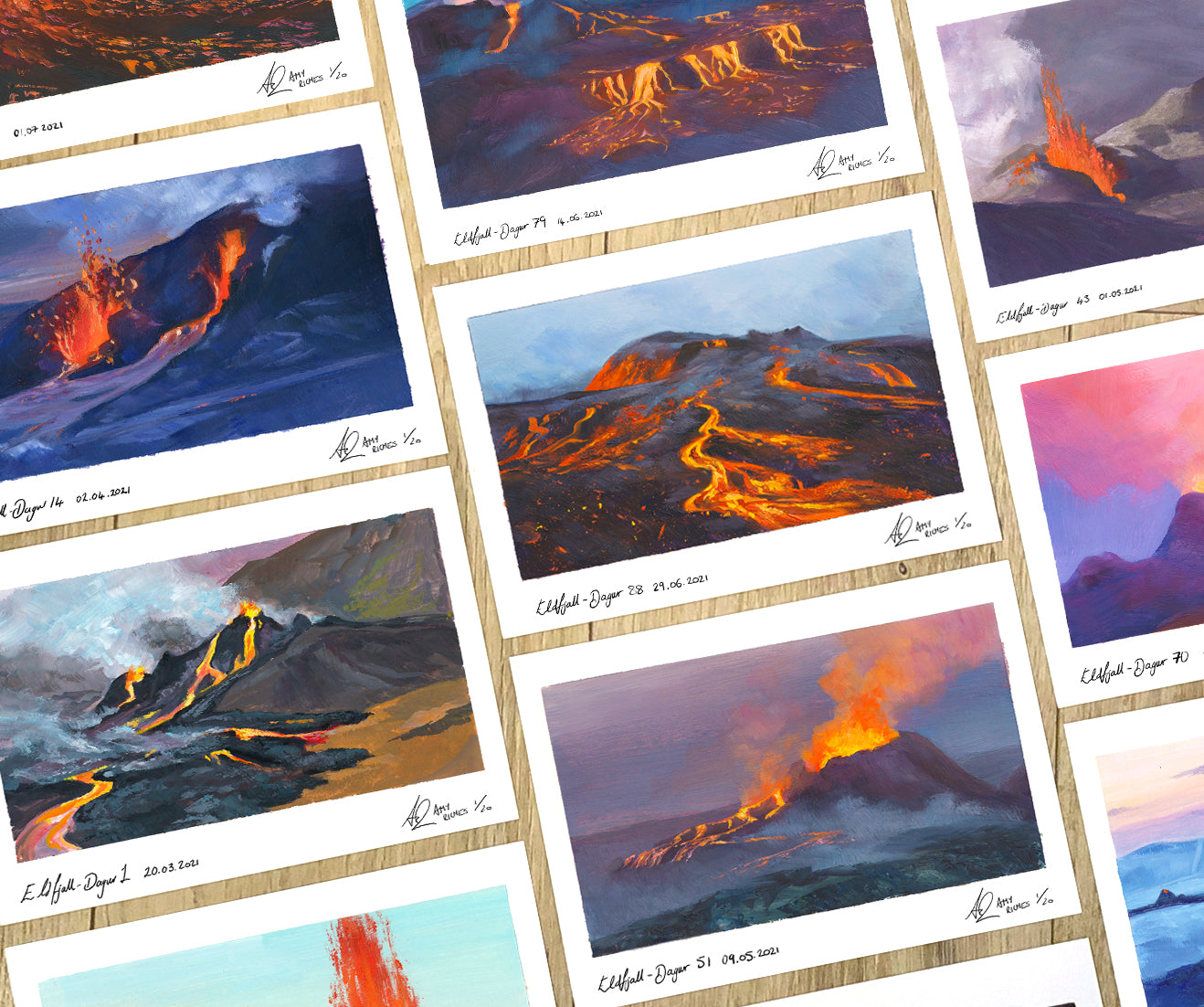 Til dæmis þá er serían mín með eldgosamyndum í takmörkuðu upplagi þar sem aðeins 20 eftirprent í A5 eru prentuð. Þegar öll 20 eftirprentin hafa verið seld, þá er það allt upplagið og fleiri eintök verða aldrei prentuð.