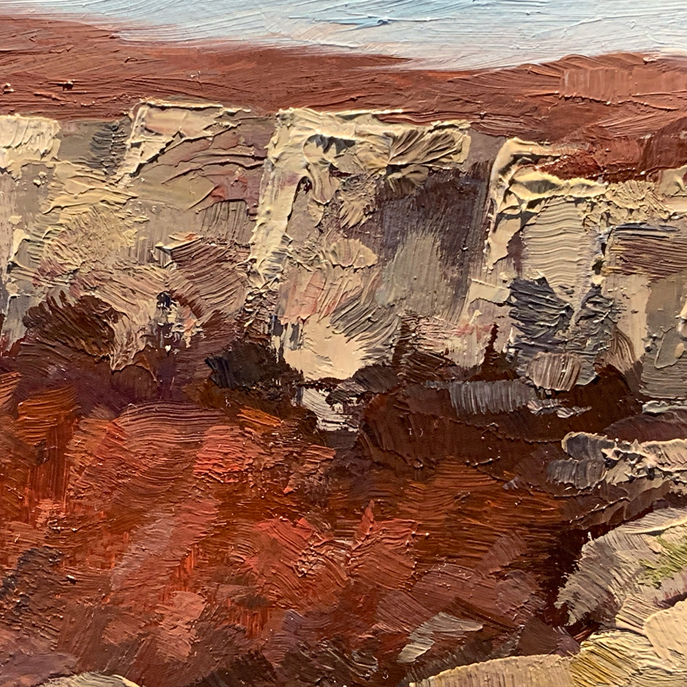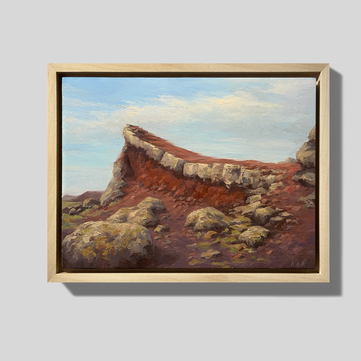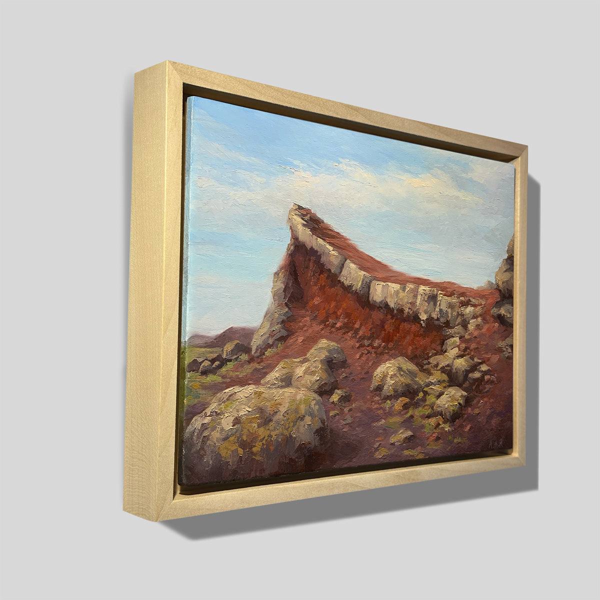 Þessi klettur er eðal dæmi um frábæra kletta og hraunmyndanir sem hægt er að finna í Rauðhólum. Með þessari dramatísku sveigju, þá er þessi klettur eins og Ljósuklettar Íslands! (Konungur ljónanna). Þetta svæði er eitt af mínum uppáhalds stöðum til að fara út að mála, enda formað af stórkostlegum eldsumbrotum fyrri tíma. Ég elska að vinna með formin og litina í þessu hrauni, þetta er eins og allt annar heimur!