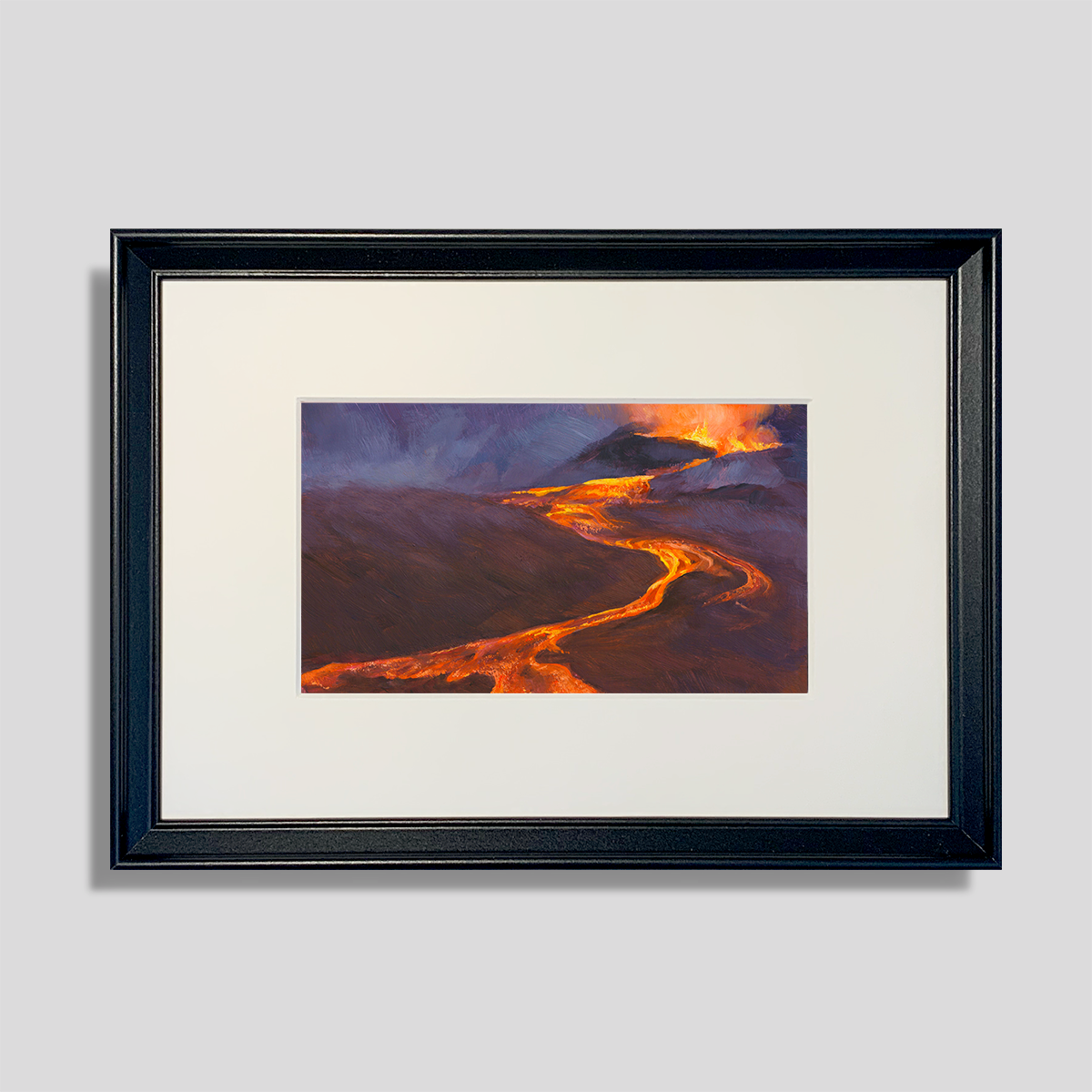Eftirprent í takmörkuðu upplagi í stærð A5. Eftirprentið er af málverki sem sýnir eldgosið í Fagradalsfjalli þann 01.07.2021
